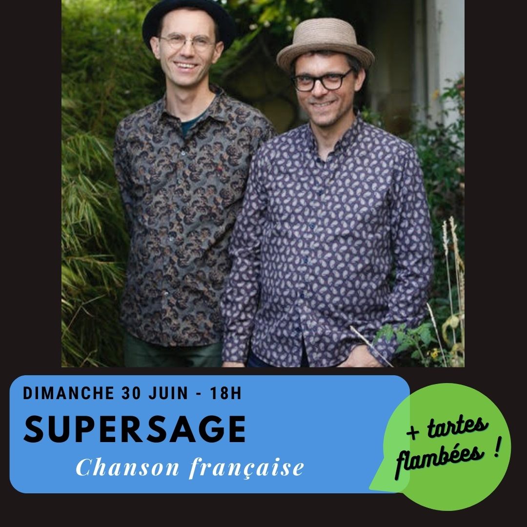 Venez à pied ou à vélo au concert de Supersage, dimanche 30 juin à 18h au Ravito des Cyclos ! Un duo tout neuf qui vous propose des chansons à texte, avec des tartes flambées au menu. Buvette bio et locale. Attention évènement annulé en cas de mauvais temps. Réservation possible par sms uniquement au 06 64 78 27 70.