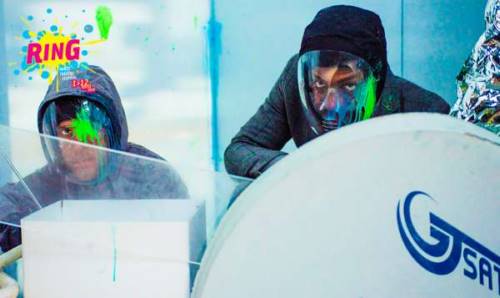 La figure du drone, sorte de dieu froid et implacable incarné ici par le viseur du paintball, s’acharne sur les deux protagonistes qui tentent d’y échapper sur un plateau blanc se teintant de couleur au rythme des impacts. Les mouvements défensifs deviennent alors danse ; l’amoncellement d’objets hétéroclites derrière lesquels se cachent les acteurs prennent l’allure de sculptures abstraites.