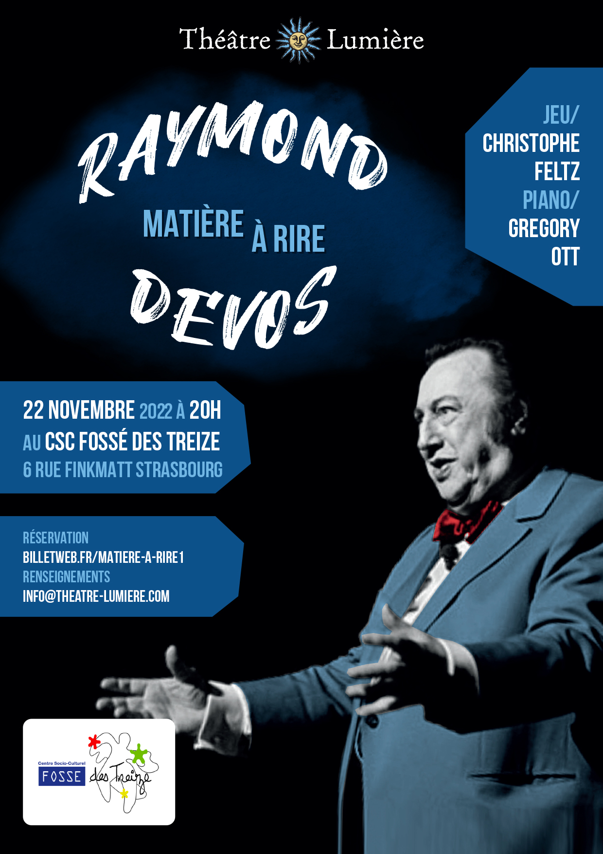 Pour ce nouveau spectacle, la compagnie Théâtre Lumière s’est immergée dans l’œuvre de l’humoriste de génie Raymond Devos. Formidable clown du verbe, jongleur de mots, funambule de la syntaxe, il nous emporte avec ses textes dans un océan de poésie, d’humour et de finesse, où les vagues de rires font place à une écume d’émotion et où le flux et le reflux nous font « marée » !
