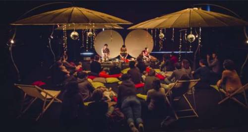 Du nom d’une berceuse bien connue en Bretagne, « Toutouig La La » se veut être une bulle de douceur, un instant de communion entre le bébé et ses parents, un moment un peu magique suspendu dans le temps. Après « La Petite Fabrique de Jouets » et « PoPoPolska ! », deux ciné-concerts à destination du jeune public, Chapi Chapo et les petites musiques de pluie ont imaginé une sieste musicale pour les tout-petits, qui prend place au creux d’un nid douillet baigné de formes lumineuses projetées. Pendant près d’une demi-heure, bébés et parents sont immergés dans un environnement chaleureux, invités à se laisser bercer par une musique délicate et lunaire composée pour l’occasion avec de beaux et vieux jouets musicaux en provenance du monde entier. Petits et grands peuvent s’allonger sous les ombrelles et les mobiles tandis qu’un jeu d’éclairage et de projections vient subtilement illuminer ce cocon (boules à facettes, projecteurs à bain d’huile, rayons de lumières…). Les parents sont libres de bouger au sol avec leurs enfants, les câliner, fermer les yeux, somnoler, rêver… Tout est permis ou presque, on s’agite, on écoute, on ferme les yeux, on bouge un peu. Les musiciens commencent petit à petit à animer leurs objets de curiosité. Les petites musiques de pluie se font entendre. La sieste peut commencer…