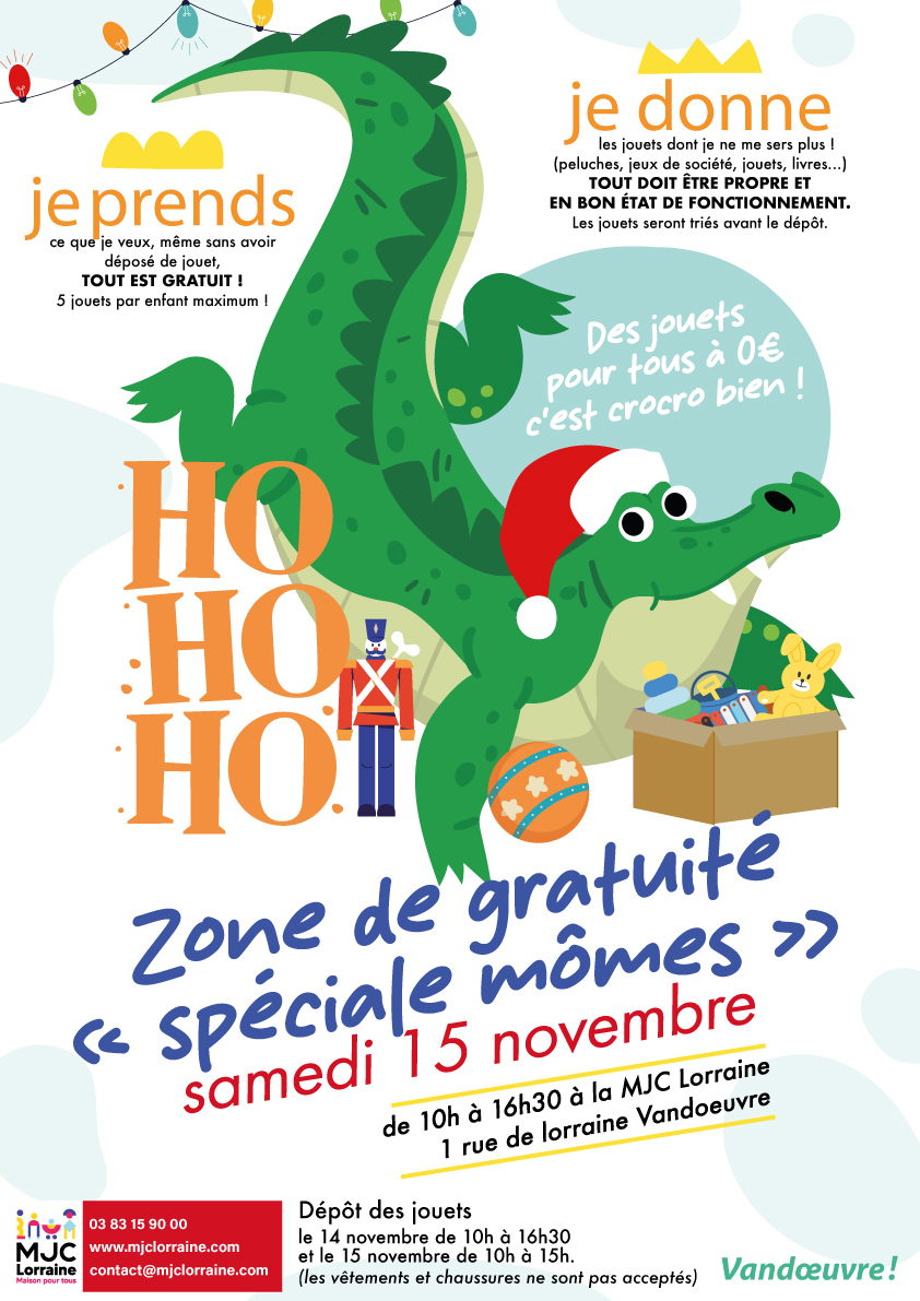 DEPOSEZ vos objets le 14 novembre de 10h à 16h30 à la MJC Lorraine ainsi que le jour même, le 15 novembre de 10h à 15h. Les jouets donnés doivent être en bon état de fonctionnement et propres (peluches lavées).