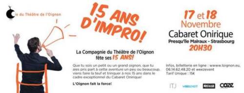 Nous avons le plaisir de vous inviter à célébrer 15 ans de spectacles, de théâtre et musique improvisés à Strasbourg, en France et dans le monde entier!
