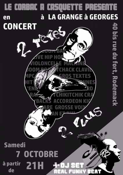 Nous avons donc le plaisir de vous convier à la Grange à Georges, avec le concert du groupe 2 TÊTES 2 PLUS, groupe de rap né en 2017 dans la région Rhône-Alpes.