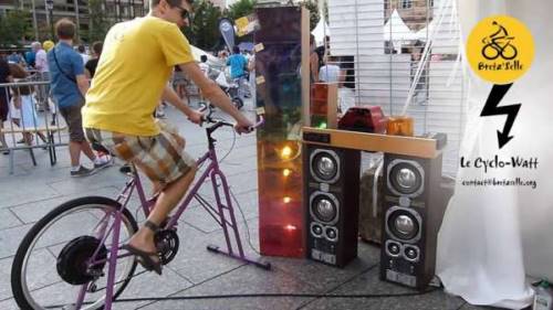Le Cyclo-watt, c’est du concentré d’énergie mollet. Pédaler, allumer 3 diodes, facile, mais qui saura générer assez d’énergie pour lancer la musique, déclencher un tourbillon de bulles et faire