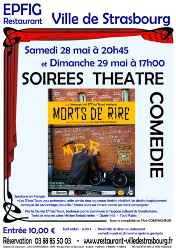 Au petit Théâtre du restaurant Ville de Strasbourg à Epfig : « Les D’trac’Teurs vous présentent cette année cinq nouveaux sketchs révélant les destins tragiquement comiques de personnages absurdes ! Venez vivre un instant mortel en notre compagnie ! P.s : second degré indispensable à la bonne compréhension du spectacle ! » INFORMATIONS : Par la Cie des D’Trac’Teurs, Soutenue par la commune et l’espace culturel de Vendenheim.