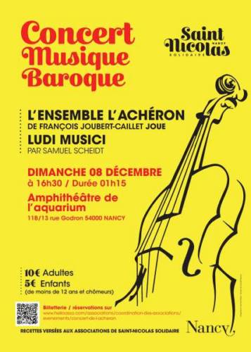 Nous avons le plaisir de vous inviter à venir au concert de musique baroque donné par l’Ensemble Musical L’Achéron dans le cadre des Fêtes de la Saint Nicolas, le dimanche 8 décembre, à 16h 30 à l’Amphithéâtre de l’Aquarium 11B, 13 rue Godron à Nancy.