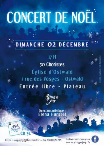 Nous clôturerons les festivités du marché de Noël de Ostwald En clôture du marché de Noël de Ostwald, la chorale Sing’n Joy vous propose de venir les rejoindre en l’Eglise St Ostwald à 17h. Sur scène une cinquantaine de choristes qui interpréteront un répertoire gospel et pop aux sonorités de Noël ! Venez passer un moment festif avec notre chorale jeune et dynamique, sous la direction de notre talentueuse chef de choeur Elena Hurstel. Avec Sing’n Joy, pas question de rester assis à simplement nous écouter, nos concerts sont participatifs, on propose à notre public de chanter et bouger avec nous ! Alors venez partager un moment festif dans la joie et la paix... Venez seul, en famille, entre amis... mais surtout avec votre bonne humeur !