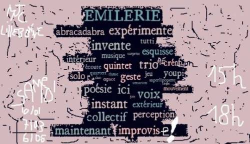 Les Emileries sont des rencontres d’improvisation libre, interdisciplinaires, entre musiciens, danseurs, circassiens, potes, performeurs Elles sont ouvertes tous, petits et grands.