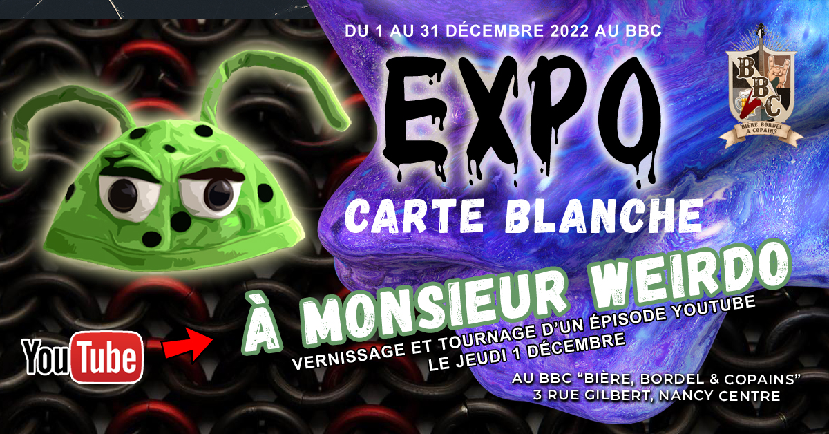 Au BBC, on aime le risque ! On a laissé carte blanche à Monsieur Weirdo pour une exposition durant tout le mois de décembre. Certes, on n’a aucune information sur le contenu de cette expo, Monsieur Weirdo nous a juste dit « Prout ! ».