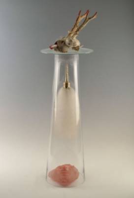 Arpenter un territoire au rythme de la marche et des découvertes : voilà l’origine de mon travail sculpté et peint.Os, plumes, végétaux, verre, papier glanés le long des chemins sont assemblés de manière fantasmagorique.