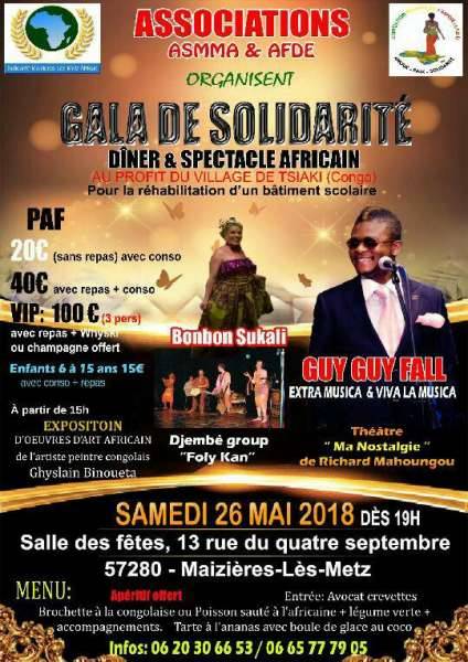 A l’occasion de la fête des mères, l’’association Solidarité Maizières-Lès-Metz Afrique et l’association Femmes de l’Espoir vous reçoivent dans la salle des fêtes de la ville de Maizières-Lès-Metz, pour un gala de solidarité " DÎNER & SPECTACLE AFRICAIN" au profit du village de Tsiaki au Congo.
