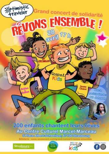 L’association "OPTIMISTIC TRAVELER" vous invite à son grand concert sur le thème du rêve ! Vous retrouverez sur scène deux réputés chorales de Strasbourg : les "Gospels Kids" d’Alphonse Nsangu-Cornu et les "Coccinelles" d’Élisabeth Kiertzner-Neiss du Centre Musical de la Krutenau. Soit 200 enfants en tout dans un spectacle unique et exceptionnel et