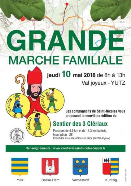 Nous sommes heureux de vous annoncer l’organisation de la neuvième marche sur le sentier des trois clériaux par les Compagnons de Saint-Nicolas et la Confrérie Saint-Nicolas de Yutz en partenariat avec les villes de Basse-Ham, Kuntzig, Valmestroff et Yutz.