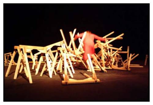 Dans une faible lueur, une silhouette tâtonne sans bruit. Elle tente simplement de mettre en place une table et une chaise afin de s’installer face au public. Mais chaque geste se désagrège en petits accidents. De légers détours insignifiants alourdissent chaque tentative de poser ou de prendre. Peu à peu le silence s’effiloche. Les objets s’ébouriffent, résistent et grincent. Le but limpide des gestes se recroqueville et s’atténue. Le sens et les objets tombent en ruine. Les nombreux débris de tentatives s’accumulent et s’entassent démesurément, accidentant tout. Il ne reste que ce corps en miettes qui tombe à plat. Et il y a un cri monumental dans l’obscurité et des mots qui tombent de sa bouche comme des pierres. Dans L’homme de Hus, Camille Boitel construit un dispositif unique, obsédé par l’effondrement, la catastrophe et tous les moyens possibles d’y survivre au gré d’un dialogue et d’un corps-à-corps avec les objets.