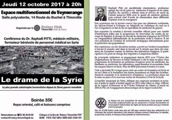 Conférence-repas animée par le Dr Raphaël Pitti. Une actualisation de la situation paraît nécessaire concernant ce drame. Les bénéfices de la soirée seront reversés à nos oeuvres, notamment en faveur de la Syrie.