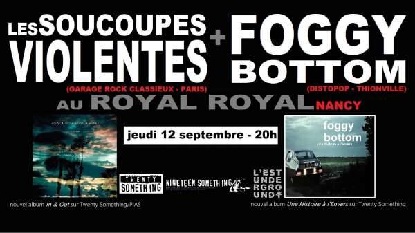 En association avec l?Est Underground et Le Royal Royal, les mythiques Soucoupes Violentes et les soniques Foggy Bottom (deux groupes de l?excellent label Nineteen Something/Twenty Something) déboulent dans l?antre Rock?n?Roll Nancéen pour y présenter leurs nouveaux albums respectifs !