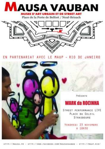 L’artiste international brésilien WARK da Rocinha, en résidence au MAUSA Vauban de Neuf-Brisach du 22 au 25 novembre, effectuera une performance urbaine gratuite en live le vendredi 23 novembre à Strasbourg, Place du Soleil, de 18h30 à 20h30 !!!