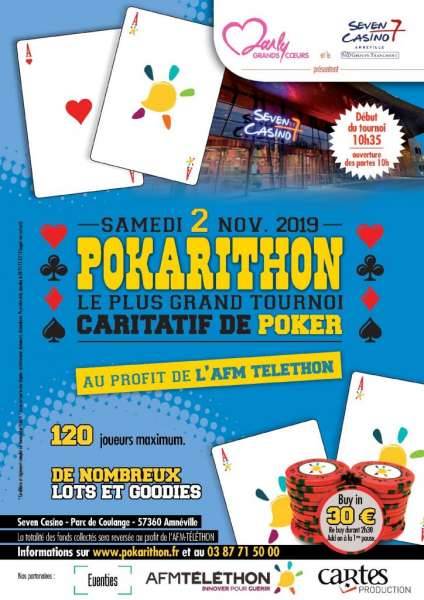 Le Samedi 2 Novembre 2019 se déroulera le plus grand tournoi caritatif de France ( En collecte au profit de l’AFM-TELETHON et en valeur de lots de prize pool ) au Profit du Téléthon 2019 en Moselle au Seven Casino à Amnéville. Plus d’infos sur https://www.pokarithon.fr/ !