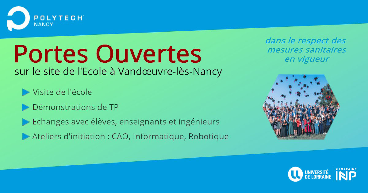 Polytech Nancy, Ecole publique d'Ingénieurs, organise sa Journée Portes Ouvertes* le samedi 5 mars de 10h à 17h, sur le site de l'Ecole à Vandoeuvre lès Nancy, avec pour les lycéens, étudiants et leur famille :
