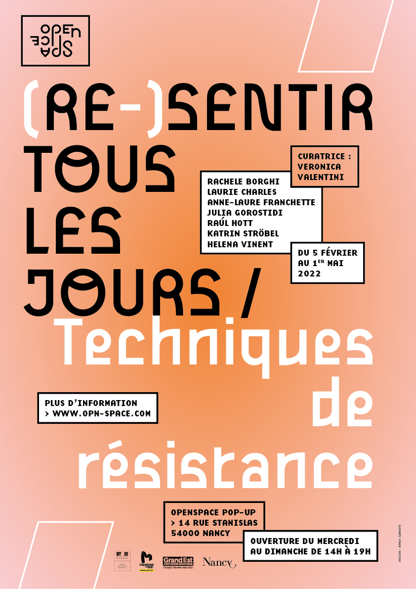 L’exposition (Re-)sentir tous les jours / Techniques de résistance présente les œuvres d’artistes, militants, chercheurs et architectes qui créent quotidiennement des formes alternatives de connaissances, de soins et de communautés. Les travaux exposés interrogent les comportements culturels qui façonnent les normes et les perceptions et recoupent des questionnements sur l’affectivité, la sexualité et la santé qui ré-évaluent l’agencement de tous les corps dans la société.
