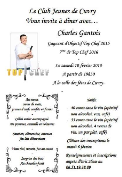 Le club jeunes de cuvry organise un repas avec Charles Gantois, gagnant d’Objectif Top chef et 7ème de top Chef 2016.