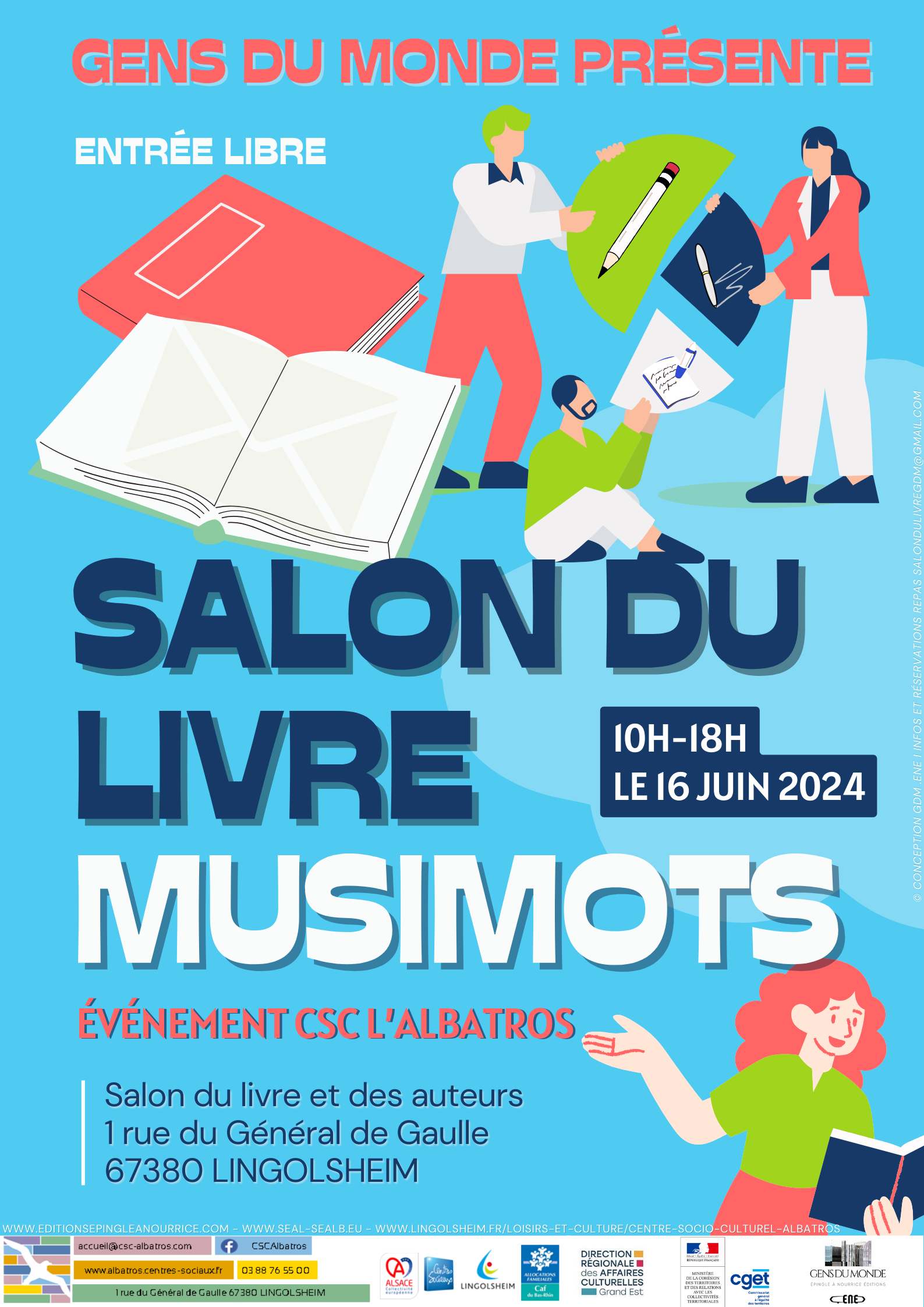 L’événement annuel autour du livre de l’association Gens du monde, le 2e Salon du livre et de la lecture MUSIMOTS, se déroulera dimanche 16 juin de 10H à 18H à l'espace socio-culturel l'Albatros au 1, rue du Général de Gaulle à Lingolsheim. Ce événement propose aux différents publics de tous âges des offres variées de livres, de lectures, des rencontres avec des auteurs en dédicaces, des ateliers, et des lectures publiques musicales - le tout en résonance avec le 16e concours d’écriture de l’association dont la thématique 2024 était De la lettre à la voix. Cet événement MUSIMOTS présente 44 auteurs et leurs livres, et 4 musiciens : Soheil Peyghambari (soliste, improvisateur, clarinettiste international), Raïlo Helmstetter (guitariste virtuose), et l'excellent duo voix-piano Carole Boyer et François Hoernel. MUSIMOTS accordera une bonne place aux lectures bilingues (farsi, turc, russe), aux 44 auteurs présents sous la présidence de Gérard Cardonne (SEALB) et à des textes d'ateliers. Bar et snacking sur place. C'est la fête ! Parking, entrée libre. ON VOUS ATTEND NOMBREUX ! salondulivregdm@gmail.com