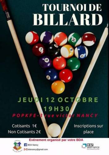 Le BDA est de retour et vous propose une petite soirée de rentrée: Tournoi de Billard au PopKfé (Kinépolis) !