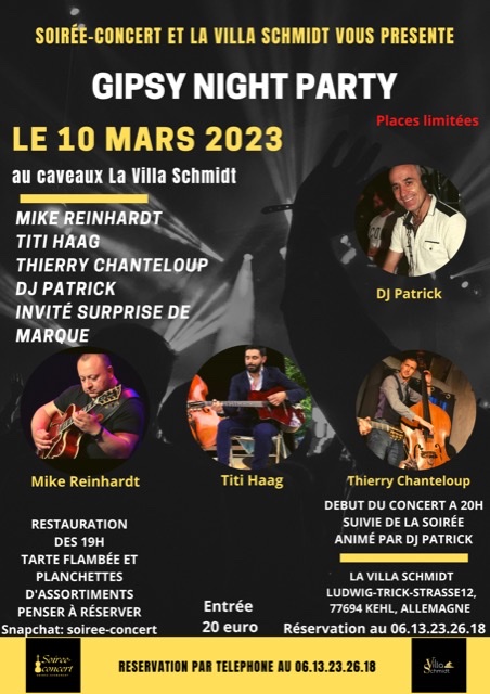 Soirée-concert et la villa Schmidt vous présente une soirée en deux parties avec en première partie un concert avec des muscisien d'exemptions Mike Reinhardt guitariste hors pair qui allie jazz manouche et musique moderne connues dans le monde entier qui ce produit très rarement à Strasbourg nous fait l'honneur de ce produire a la villa Schmidt accompagnée a la guitare rythmique par Titi Haag et Thierry Chanteloup a la contre basse puis Notre DJ Patrick préféré dans le grand est enflamera la piste pour la deuxième partie de la soirée restauration sur place places limitée réservation par téléphone au 06.13.23.26.18 entrée 20euro à bientôt cordialement