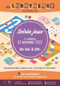 Rendez-vous à la troisième soirée jeux de la Ludo’ : animation, convivialité et plaisir seront au rendez-vous autour de jeux de société pour finir la semaine dans une ambiance ludique ! En famille, entre jeunes, à tout âge, seul ou à plusieurs, cet instant inédit est ouvert à tous et à tous les niveaux, débutant ou confirmé, guidé par l’expérience des ludothécaires qui seront présents sur place. Ce moment de rencontre et de partage entre adhérents, habitants et habitués du quartier du Conseil des XV se déroulera le vendredi 25 novembre 2022 de 16h à 20h, à la Ludothèque au 24 rue de l’Yser à Strasbourg.