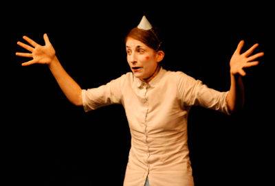 Visage et nez blancs, bouche pincée et pommettes rouges, sourcils noirs très expressifs, corsage fermé bien haut et jupe turquoise totalement ringarde, Helene Ventoura vous raconte une version de Cendrillon complètement délirante. Humour noir et surprises en tout genre émaillent un texte dit avec un débit imparable, sur un mode pince-sans-rire digne de Valérie Lemercier. C’est surprenant, décalé, moderne, insolite et…vraiment très drôle.Wally – J’ai arrêté les bretelles