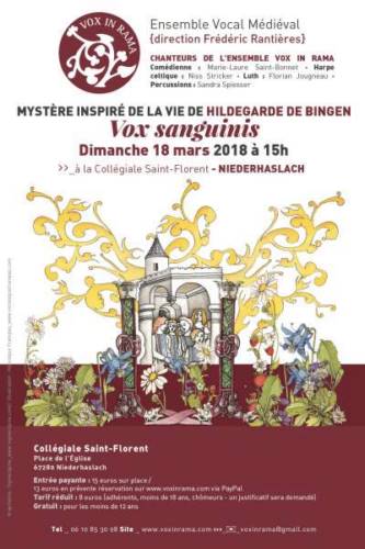 L’ensemble médiéval Vox In Rama propose au public de (re)découvrir la célèbre abbesse du XIIe siècle Hildegarde de Bingen au travers de ses Visions, écrits, Symphonies et réflexions thérapeutiques, dans un drame musical original, à la fois contemporain et médiéval.