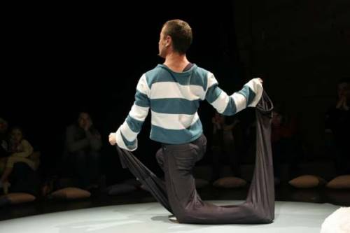Propice aux déformations ou aux cache-caches, le vêtement est chez le tout-petit un véritable terrain de jeu au quotidien. Sur scène, un personnage se découvre avec plaisir et amusement des vêtements élastiques : trop petits ou trop grands, ils s’étirent, se déploient en ailes, chatouillent et s’entrelacent. Un spectacle intime et joueur dans lequel les enfants installés tout autour du comédien inventent avec lui un drôle de langage.