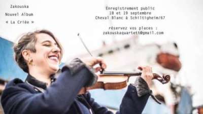 Après deux ans de création passés à naviguer entre Constanța et Strasbourg, Athènes et Istanbul, Heraklion et Marseille Le nouveau répertoire de Zakouska est prêt ! Il s’appelle « La Criée ». Pour lui donner vie nous avons besoin de vous.L’enregistrement se fera au Cheval Blanc à Schiltigheim(67) les 18 et 19 septembre 2018 et nous aimerions vous avoir avec nous.Nous vous invitons à venir découvrir « La Criée » pour la toute première fois et faire de cet enregistrement/concert un moment partagé. Il sera d’une musique qui traîne dans les ports et dans les marchés, fait de mélodies qu’on vole dans les tavernes et sur les parquets. « La Criée » sera saisie à la volée, avec vous, avant de partir s’égosiller sur les routes.